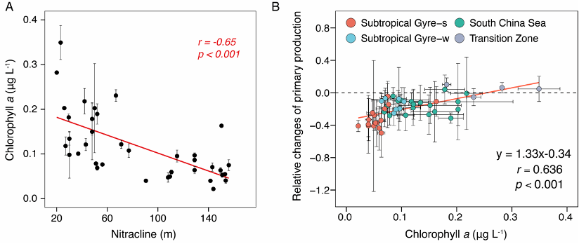 A:部分培养实验所在站位硝酸盐跃层深度与叶绿素浓度相关性分析图;B:叶绿素浓度 (x轴) 与酸化前后浮游植物群落初级生产力变化百分比 (y轴) 相关性分析图。