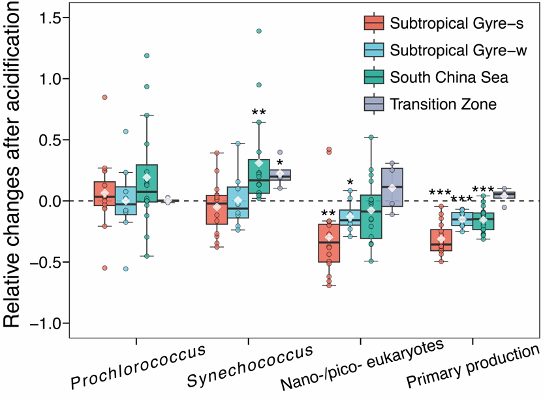 1)酸化降低热带亚热带寡营养海域浮游植物群落初级生产力 (图1B):其中,夏季副热带流涡区(NPSG)显著下降约30%,冬季副热带流涡区和夏季南海寡营养区域显著下降约15%。但酸化对中纬度北太平洋过渡区 (NPTZ) 没有显著影响。