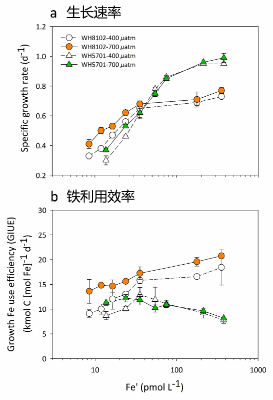图1. 远洋株WH8102和近岸株WH5701在不同CO2浓度和铁浓度下的比生长速率(a)和铁利用效率(b)