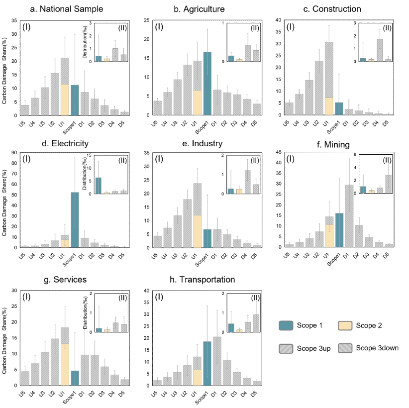 基于对上市公司碳足迹的全面核算,本研究进一步引入社会碳成本(Social Cost of Carbon,SCC),将企业活动各环节的碳排放量转化为相应的经济损失,从而衡量企业行为对社会造成的负外部性。研究结果表明,中国上市公司的碳损失主要源于价值链排放,其中一级供应商为关键贡献源,平均占总碳损失的21.58%。不同行业之间呈现显著差异,电力企业碳损失最高,且以直接排放为主,采矿企业的碳损失则以下游用户贡献最为突出,而工业、建筑和服务业则普遍表现为间接排放驱动。