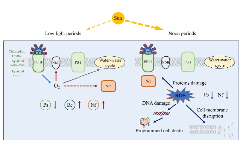 图2. 束毛藻 (Trichodesmium erythraeum IMS 101) 在磷限制条件下的光生理学过程。红色箭头表示正效应,蓝色箭头表示负效应。Ps,净光合作用;Re,呼吸作用;Nf,固氮作用;Nif,固氮酶;ROS,活性氧。在较低紫外辐射下,束毛藻固氮作用因光合放氧受抑制而被促进;在高阳光紫外辐射下,DNA与蛋白质受损及ROS的积累,导致碳氮代谢过程受阻及细胞死亡。