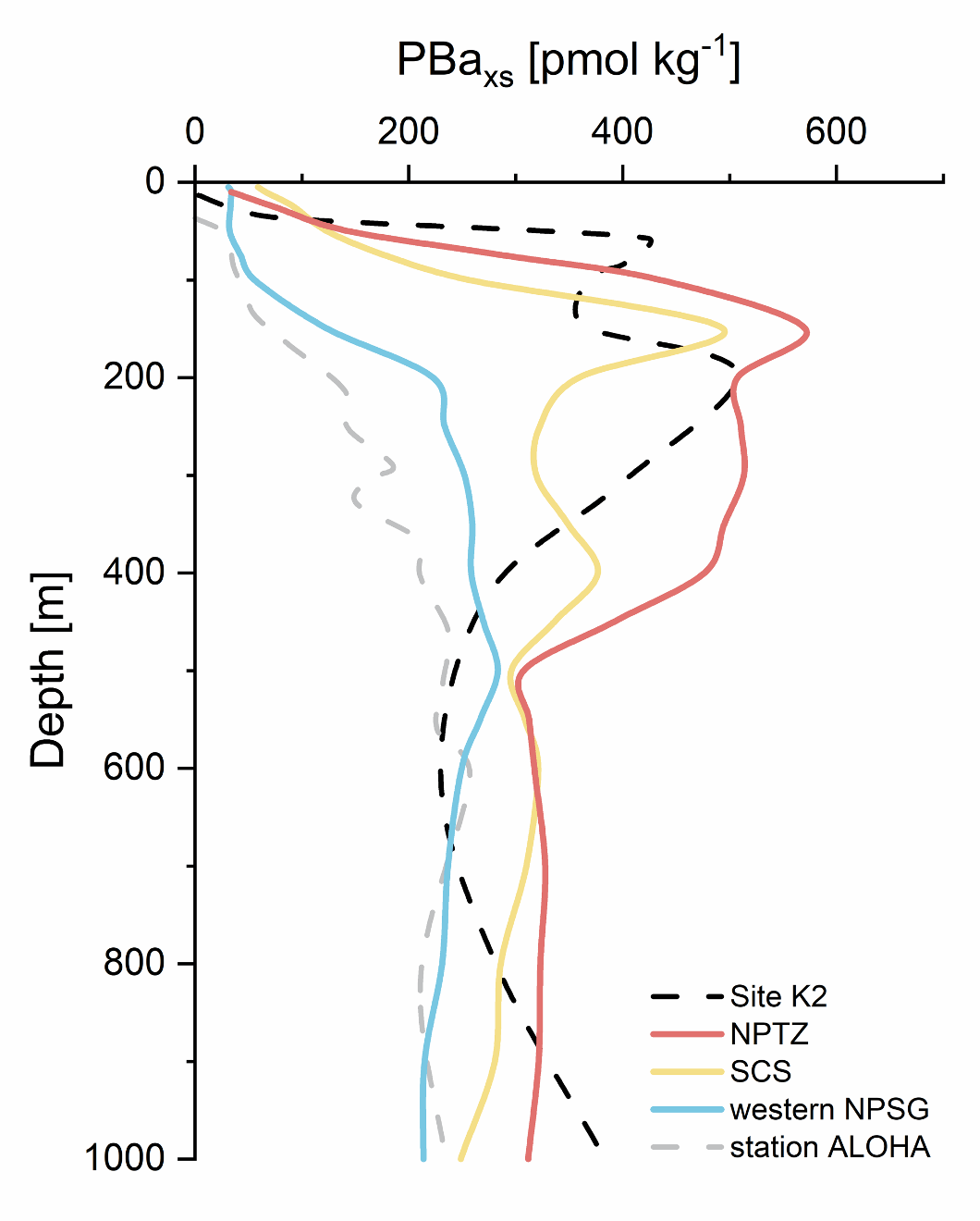 不同区域0-1000米的平均PBaxs浓度分布存在显著差异:南海、北太平洋过渡区和K2站的PBaxs浓度较高,弱光层极大值显著且层位较浅;而西北太平洋副热带流涡区和ALOHA站的PBaxs浓度较低,弱光层极大值相对微弱且层位相对较深(图2)。这一空间变化特征暗示西北太平洋不同区域的弱光层有机碳再矿化强度各异。