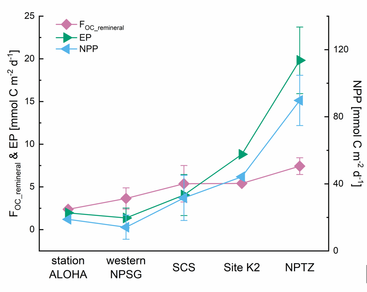 图3. 北太平洋各区域弱光层有机碳再矿化通量(FOC_remineral)、真光层净初级生产力(NPP)和有机碳输出通量(EP)