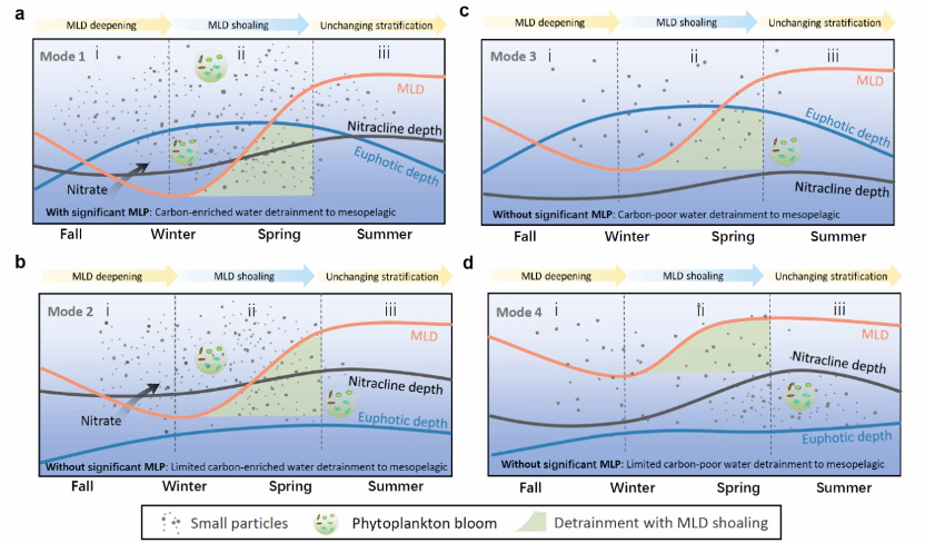 综合分析发现,有效的季节性混合层泵需满足三项关键条件:(1) 有明显的季节性混合层变化;(2) 混合层加深阶段能带入营养盐,促进初级生产;(3) 混合层变浅阶段能将富POC水体输送至弱光层。
