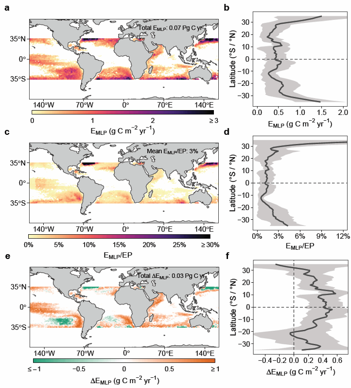 研究估算了35°N 至35°S范围内由季节性混合层泵驱动的碳输出 (EMLP, 图1)。结果显示,EMLP范围为 −0.9–7.6 g C m-2 yr-1,占总有机碳输出的比例为−3%–53%。虽然整体强度低于高纬度海域,但在部分区域,混合层泵的贡献比例与高纬度相当。这意味着,低纬度海洋混合层泵的碳输出并非微不足道,而是一个“隐藏且重要”的碳泵机制。