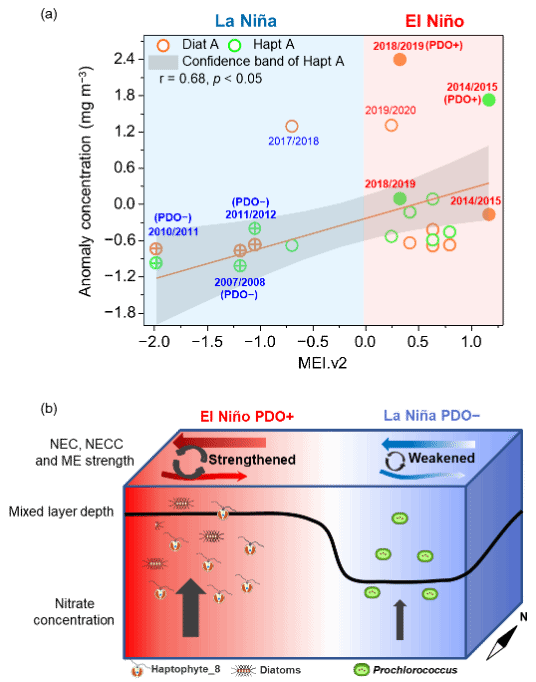 热带太平洋浮游植物在全球生物地球化学循环中扮演关键角色且对气候变化高度敏感。传统观点认为,在厄尔尼诺-南方涛动(ENSO)与太平洋年代际振荡(PDO)的暖期,海洋层化加强抑制营养盐垂直输送,进而导致浮游植物生物量下降、细胞粒径变小。