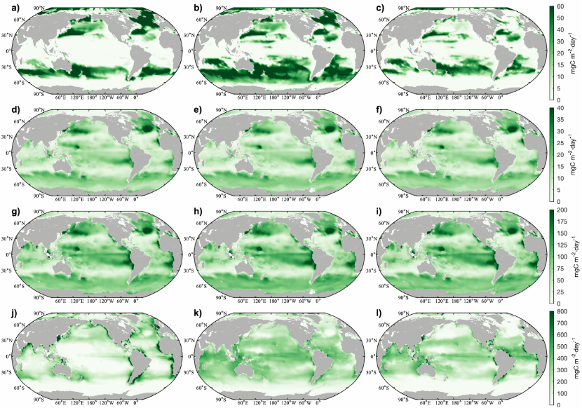 图2. 磷-碳-氧耦合循环逆模型中,真光层底部输出通量和初级生产力的空间分布(mg C m-2 day-1)。(a)-(c),DOCl输出通量;(d)-(f),DOCs输出通量;(g)-(i),POC输出通量;(j)-(l),DOCl初级生产力。其中第一列基于SeaWiFS VGPM NPP产品,第二列基于MODIS CAFE NPP产品,第三列基于VIIRS CbPM NPP产品。