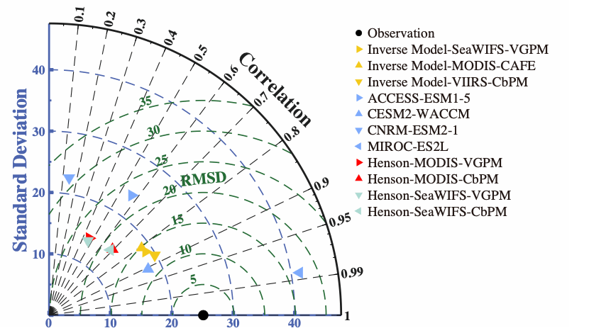 图3. 磷-碳-氧耦合循环逆模型、地球系统模式以及经验方程估算的100米深度处POC输出通量与长时间序列站点观测值之间的对比。图中蓝色、黑色和绿色坐标轴分别代表各模型POC输出通量的标准差、模型与观测值之间的皮尔逊相关系数以及均方根偏差。