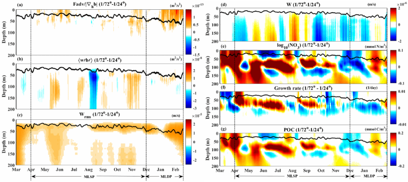 图2. 中小尺度动力过程驱动的物理机制与生物地球化学响应的季节性演变(1/72度分辨率模拟结果减去1/24度分辨率模式结果)