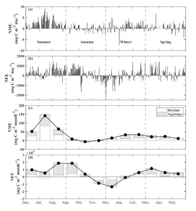 图2. 大型海藻养殖区CH4通量(NME)和CO2通量(NEE)多尺度时间变化