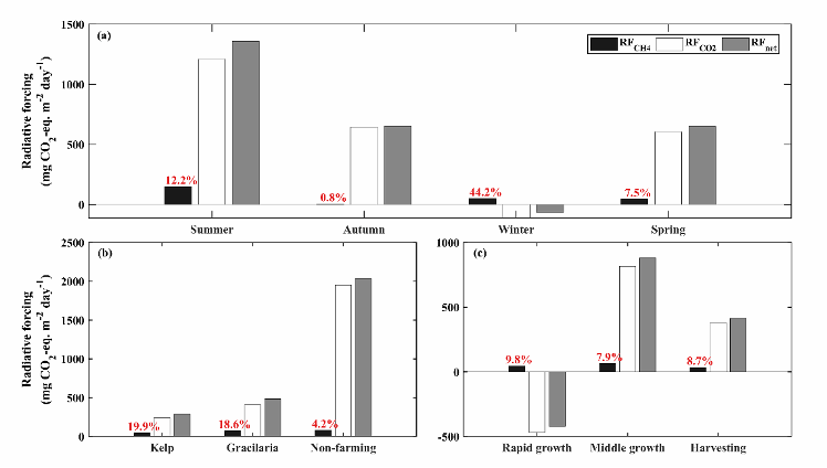 图3. 大型海藻养殖区不同季节(a)、养殖期(b)及海带生长阶段(c)CH4(RFCH4)和CO2通量(RFCO2)及两者(RFnet)的净辐射效应。其中,养殖期包括海带(Kelp)、龙须菜(Gracilaria)和非养殖期(Non-farming)。