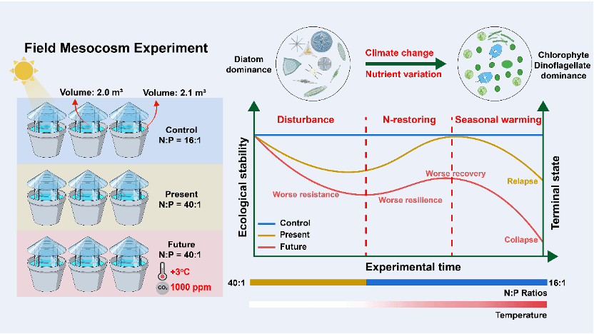 人类活动导致大量氮素排入海洋,使得近海海域氮磷比严重失衡,部分海域氮磷比已从海洋生态系统经典的 Redfield 比值 16:1,升高至约40:1。氮磷比失衡不仅会改变浮游植物种群结构,还会加剧赤潮等有害藻华的爆发风险。与此同时,海洋酸化、暖化等气候变化现象,也被证实与藻华爆发趋势密切相关。在此背景下,一个亟待解决的科学与实践问题是:将氮磷比恢复至16:1能否有效重构浮游植物生态系统,助力其抗性、韧性、恢复力及生态服务功能的恢复?气候变化是否会影响这一重构效果?
