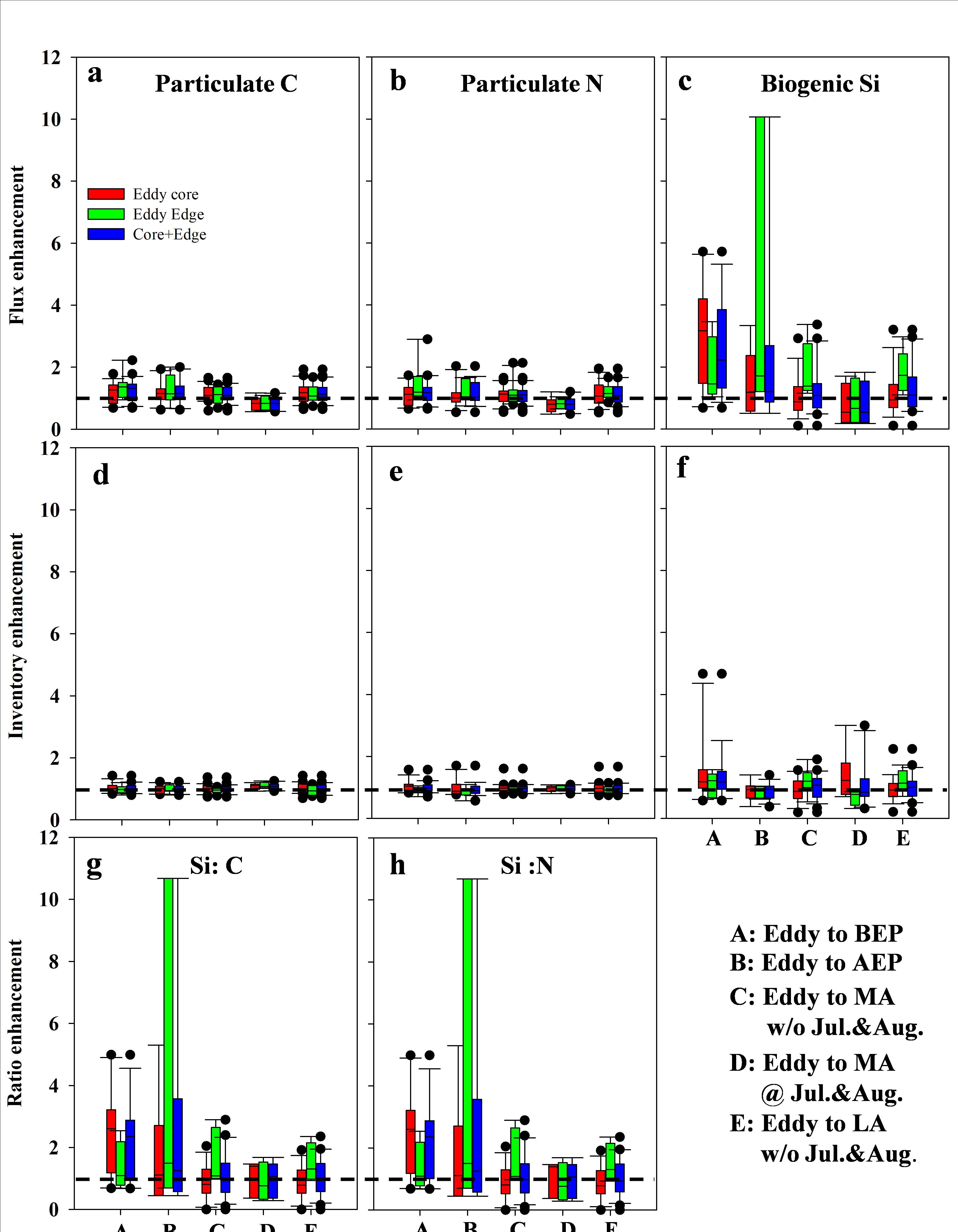 结果分析所得,对于单个涡旋而言,无论是碳输出还是硅输出都存在很强变异性,这与已有发现一致。但是,如果综合分析所有涡旋的输出通量数据,并与不同非涡旋的参比相比较,结果表明硅输出通量增加了200 ± 80%,而对于碳和氮输出而言,其量级却与这些参比相当或者略微增加(如图2所示)。因此可得,综合考虑时间和空间的因素后,涡旋增强了硅输出,却并未增强碳氮输出。该研究也暗示未来研究可能需要调查其他碳输出途径以平衡进入真光层的营养盐通量。