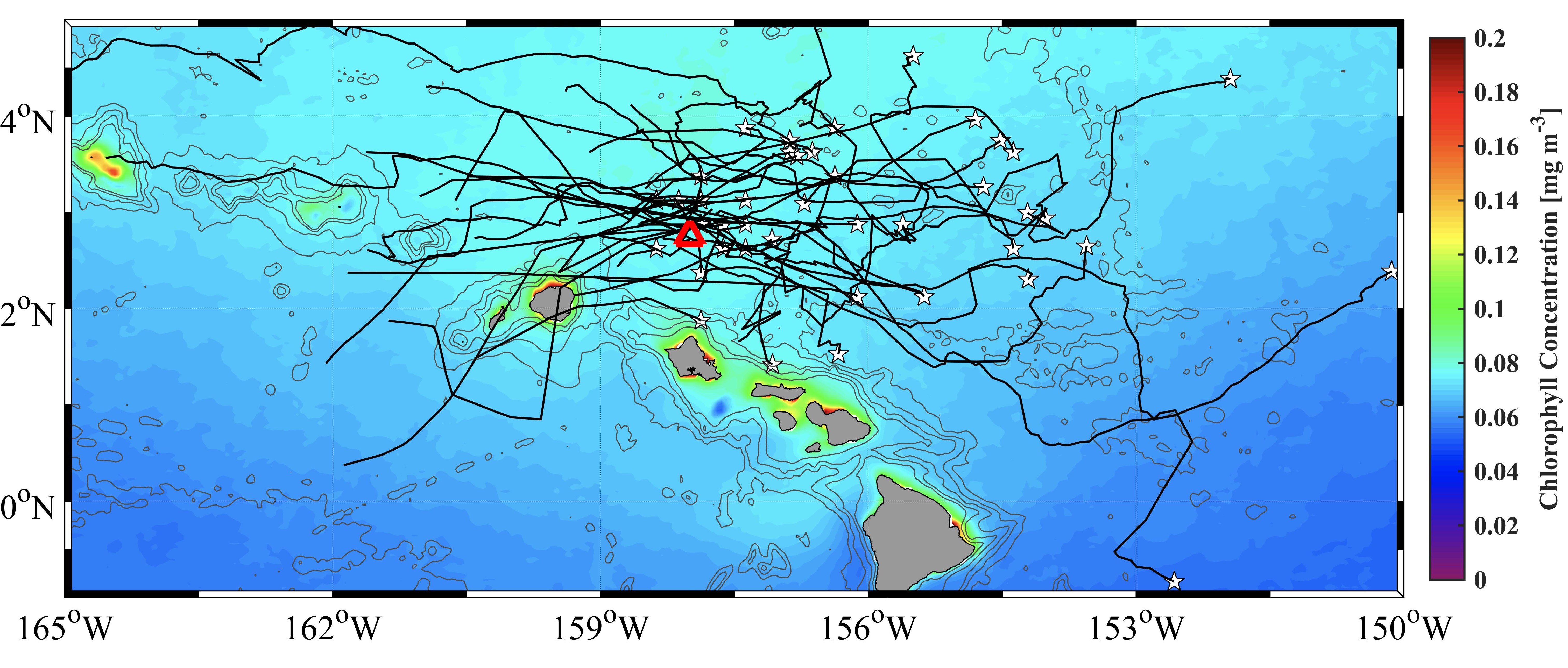 图1 1993-2018年经过北太平洋流涡区ALOHA时间序列站的气旋式涡旋轨迹图。图中红色三角为ALOHA站位;白色五星为涡旋的起源点