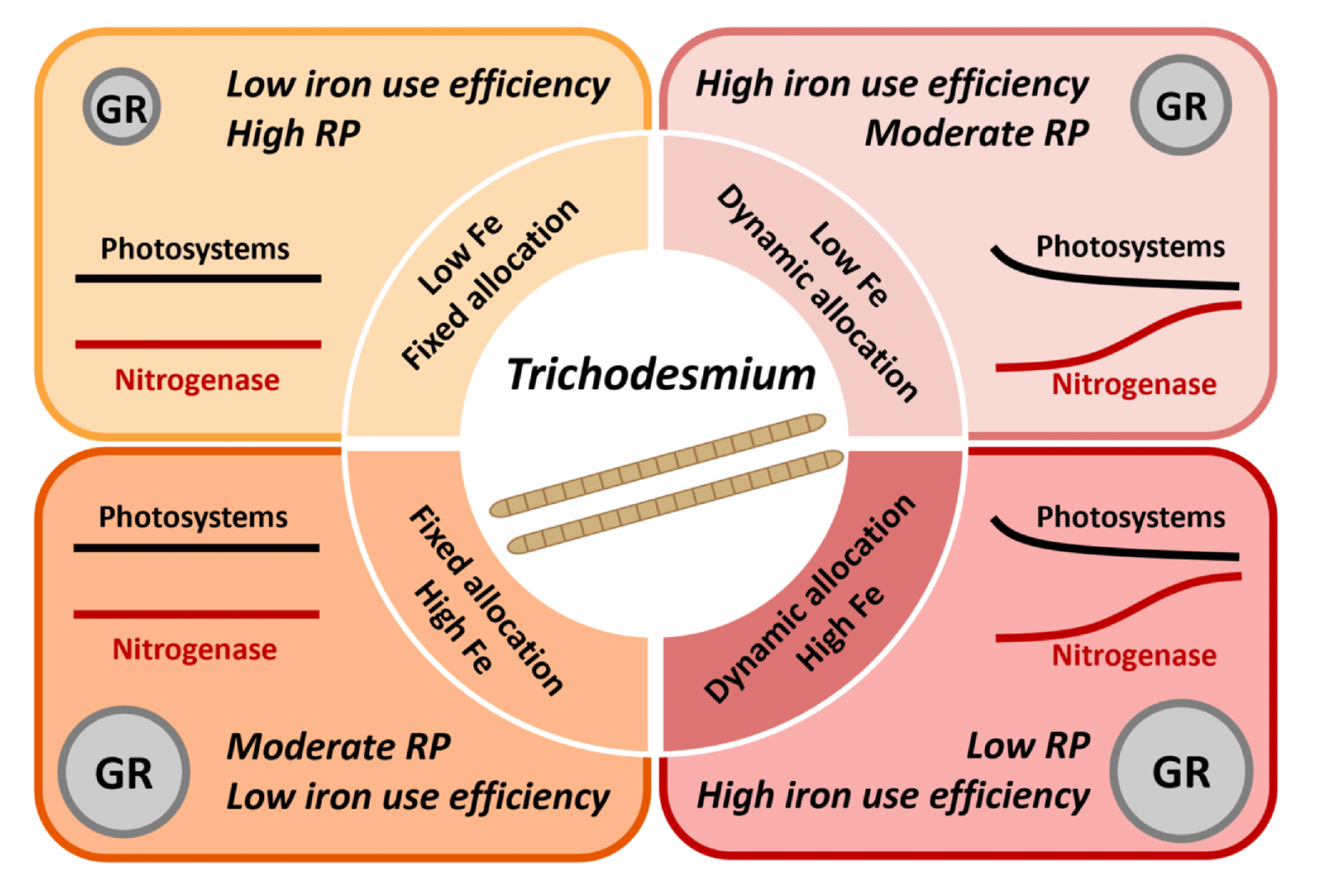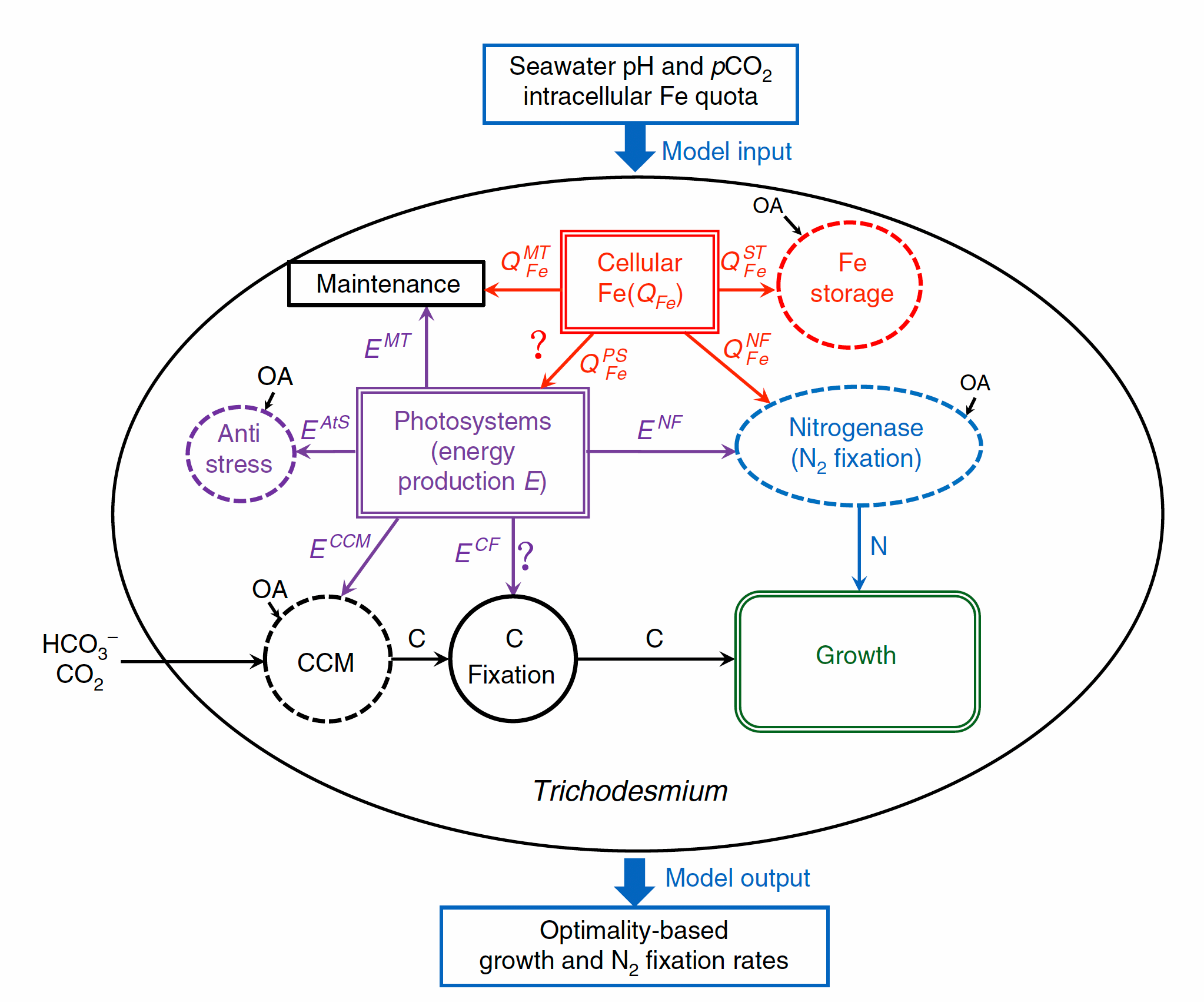 2019年,该团队与厦门大学史大林教授团队合作,在Nature Communications上发表了基于稳态的束毛藻藻丝体最优能量与铁分配细胞模型。研究量化了海洋酸化如何影响束毛藻的胞内过程,指出酸化主要通过降低固氮酶效率来抑制其固氮速率。基于该模型,该研究预测若人为CO2排放持续增加,本世纪末海洋酸化可能导致全球束毛藻的固氮潜力下降27%。该工作为定量理解海洋酸化对束毛藻固氮作用的影响奠定了基础。