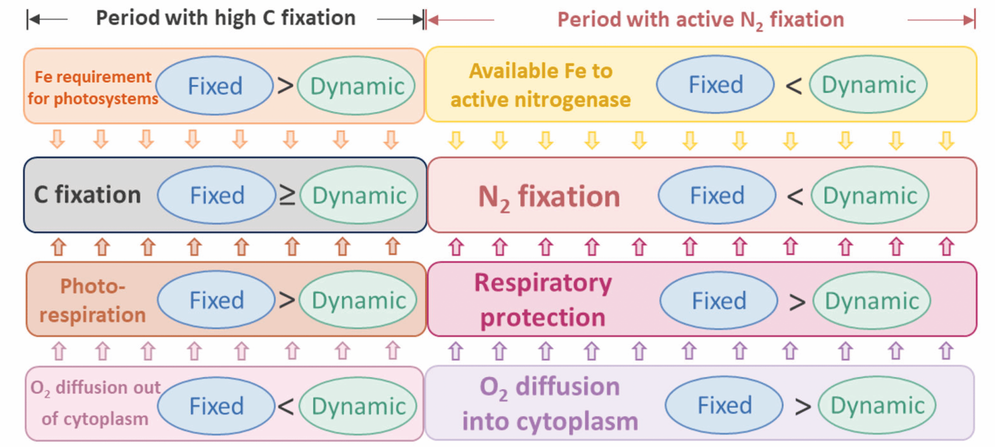 为了探讨光合产氧与固氮忌氧在束毛藻胞内的并存机制,2022年团队在mSystems上发表了引入日间变化的生理模型。模型分析表明,束毛藻可能无需严格的光合与固氮的空间隔离(即分化出专门的固氮细胞),仅依靠时间上的隔离及呼吸保护等机制,即可在日间维持较低的胞内氧气水平并实现固氮。这一结果为解释此前文献中关于“是否存在空间隔离”的不同观测证据和认识分歧提供了理论参考。