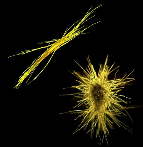 图1. 束毛藻显微图片;束毛藻可以以单体藻丝体存在,或者由藻丝体集群形成束状体