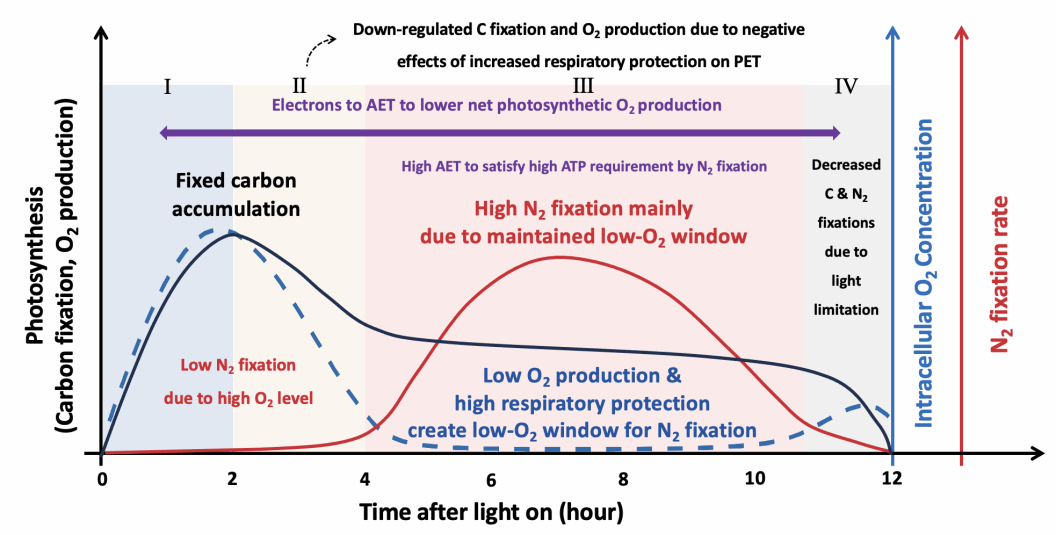 图3. 基于束毛藻日间动态模型提出的光合与固氮时间隔离机制