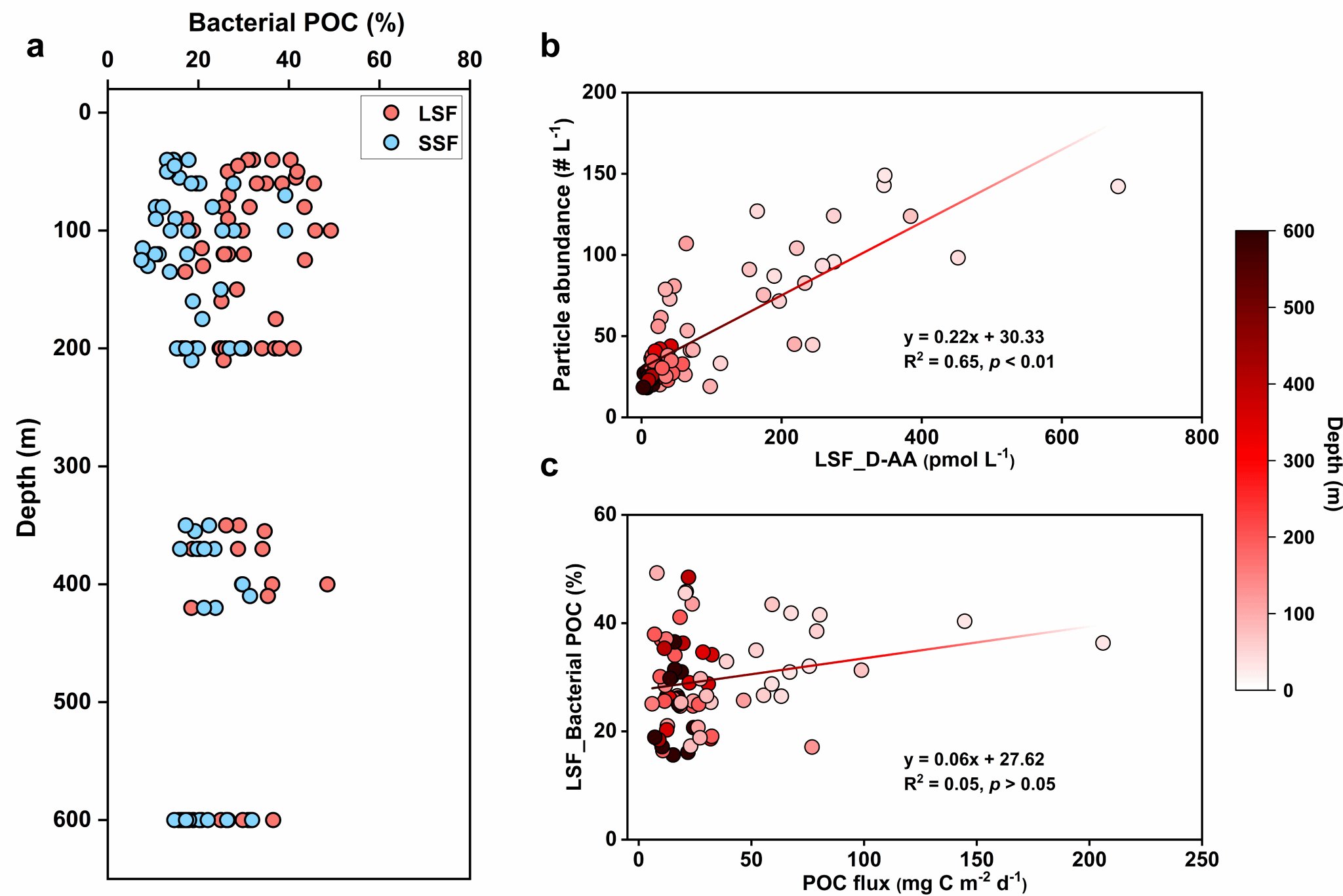 基于D-氨基酸分子标志物定量结果,研究发现细菌来源碳在POC中占比显著:大颗粒中约为30%,小颗粒中约为20%。这一比例远高于传统基于细胞丰度估算的结果(<5%),表明细菌碎屑有机质是POC的重要组成部分。
