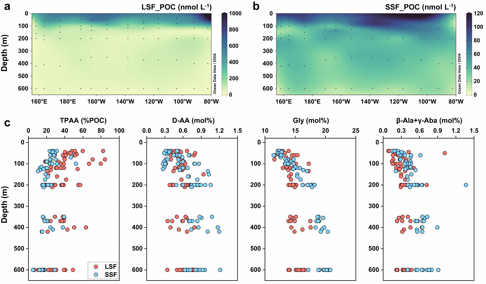 观测结果显示,POC通量在上层约150 m以内迅速衰减,但主导POC通量的大颗粒(>51 μm)在整个下沉过程中保持相对稳定的分子组成特征,并且四种基于氨基酸组成和丰度的指标均表明大颗粒中的有机质降解程度较低,仍处于“新鲜”状态。相反,小颗粒(1–51 μm)随深度表现出明显的降解信号增强,说明其经历持续的细菌改造。