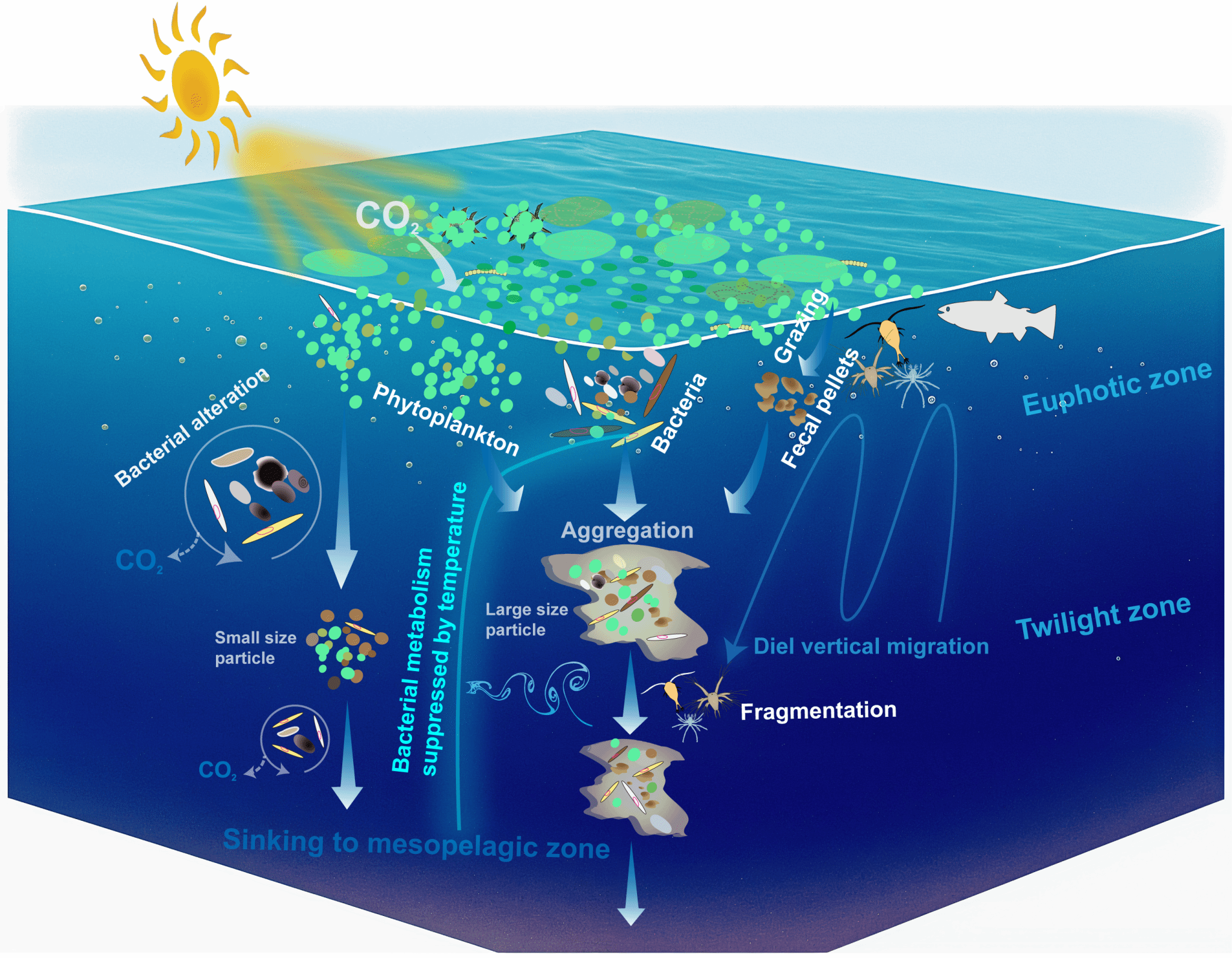 研究提出,细菌物质在真光层中随颗粒形成过程被富集,并以细菌残体或结合态有机质形式嵌入颗粒结构,在快速下沉过程中被“协同输出”至中层海洋。与此同时,POC通量的衰减主要受物理过程控制,包括湍流剪切以及浮游动物活动等过程导致的颗粒破碎,而非传统认为的细菌降解主导。该结果表明,生物碳泵效率不仅取决于有机质降解速率,更受到颗粒动力学过程及微生物来源碳贡献的共同调控。