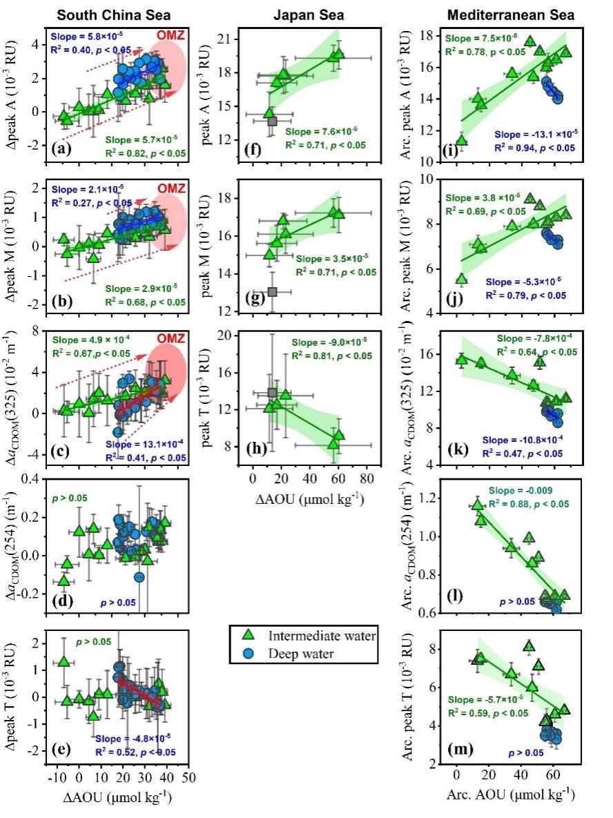 基于太平洋、印度洋和南大洋等开阔大洋内部的研究表明,类腐殖质组分的荧光强度(FDOMH)与吸光组分CDOMUVA(以aCDOM(325)表示)与表观耗氧量(AOU)呈正相关关系,因此溶解有机质(DOM)的光谱分析能有效示踪海洋无光层中微生物介导的活泼碳向惰性碳的转化过程,其斜率变化可以量化这些DOM组分的产生效率,再结合现场氧消耗速率数据,可以进一步定量评估这些有机组分的周转。由于深海水团的碳、氧信号还包括水团物理输运和混合的贡献,本研究分别通过三端元混合模型(南海)、氧消耗速率逆推法(日本海)和水团原型值(archetypal value)(地中海和开阔大洋)的方法将其扣除,得到各个海盆内部由现场生地化过程产生的“净”DOM光谱参数和“净”AOU之间的相关关系(图2)。