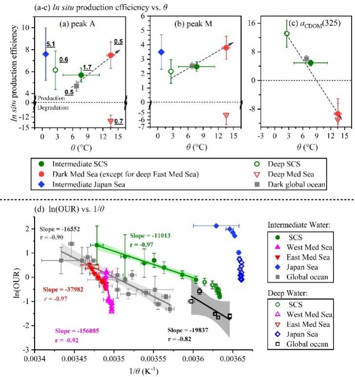 将上述反应系列与海盆内部温度参数进行综合分析,我们发现升温有助于提高类腐殖质荧光组分(FDOMH)的现场产生效率,但会降低CDOM吸光组分aCDOM(325)的现场产生效率(图3a-c)。但是,当温度较高(~14°C)但活泼碳底物不足时(真光层输出的可降解有机碳浓度低,如地中海),微生物将不得不耗费更多的能量利用一些(半)惰性碳源来维持新陈代谢,表现出“深海活泼碳限制”特征。
