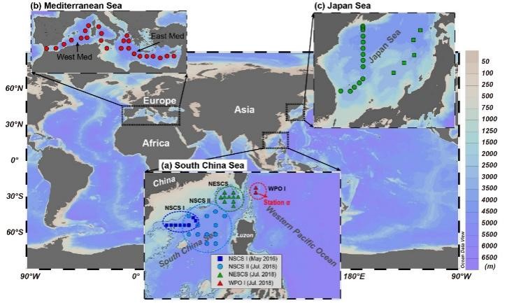 图1 南海、西太调查站位及文献资料中的日本海、地中海调查站位