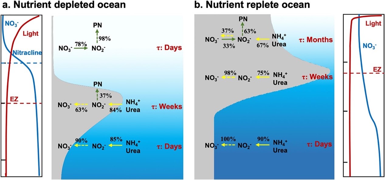 上述两种过程加之氨氧化、亚硝酸盐氧化微生物对于光敏感性不同,使得亚硝酸盐得以在寡营养盐次表层以及亚极区海域的表层光区累积。此外,我们还首次发现尿素氧化在亚硝酸盐极大层形成中扮演重要作用(图1)。