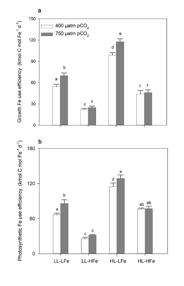图2 P. tricornutum在不同光、铁和酸化处理条件下的基于生长速率的铁利用效率(a)及基于固碳的铁利用效率(b)