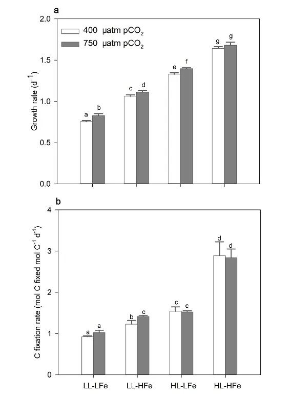 图1 P. tricornutum在不同光、铁和酸化处理条件下的生长速率(a)与固碳速率(b)