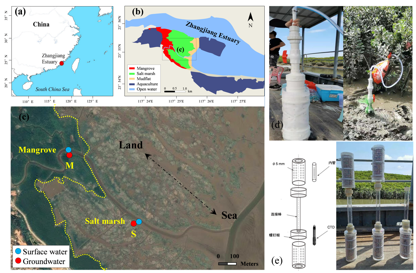 漳江口红树林观测站位(a-c)及地表水-地下水采样(d)和观测(e)装置