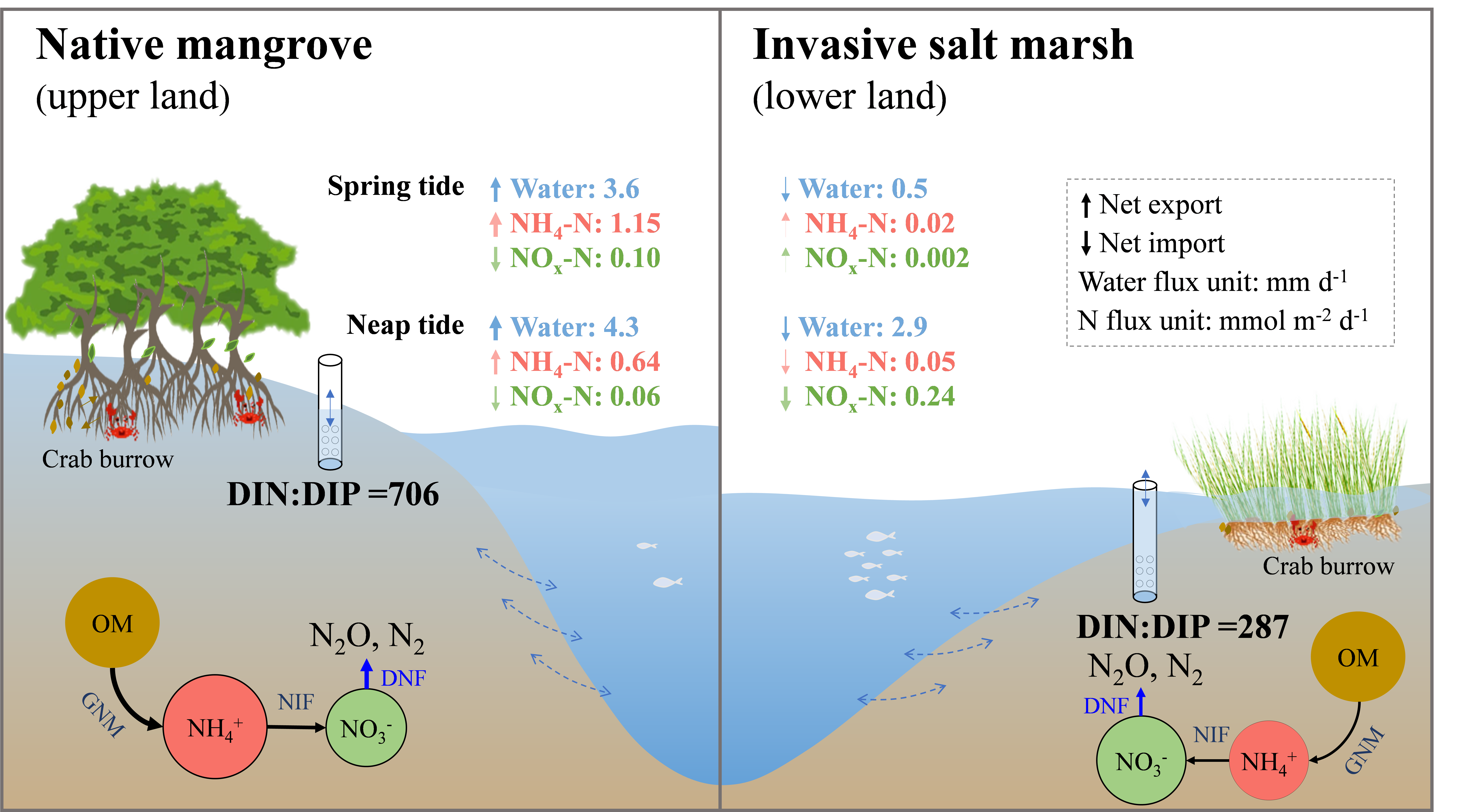 团队依托福建台湾海峡海洋生态系统国家野外科学观测研究站,在红树林、盐沼(互花米草)潮沟边坡开展地下水和地表水定点时序观测,综合运用原位水文和水化学同步观测策略,开展学科交叉合作研究。该研究初步揭示了地下水-地表水交换驱动的滨海湿地系统营养盐的源汇特征,为下一步深入研究盐沼入侵所形成的红树林-盐沼共生系统氮与碳耦合转化过程和蓝碳机制提供了基础,也为滨海湿地生态修复提供有益的理论参考。