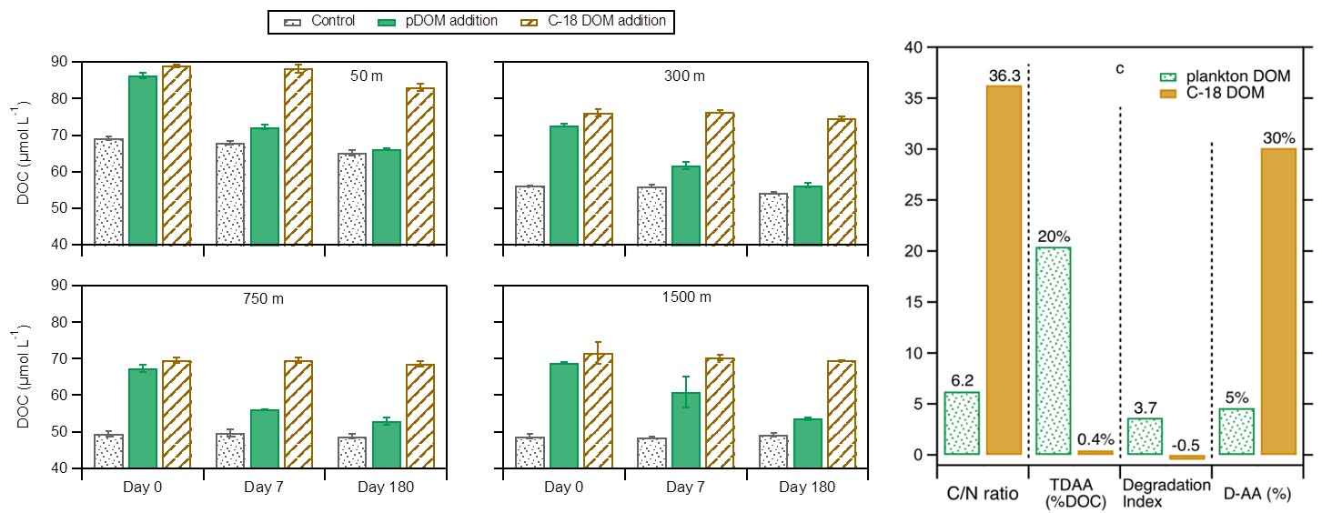 2020年,沈渊与Ronald Benner再次合作,通过培养实验对比海洋微生物对两种浓度相似但分子组成显著差异的DOM的响应(图1)。结果发现,来自大洋不同深度的微生物能够快速利用浮游生物源DOM,但相同的微生物却难以降解深海DOM,表明DOM的生物可利用性主要受控于其组成结构等分子属性,支撑了“分子组分/结构稳定性假说”,研究成果于2020年发表在L&O期刊,累计引用近30次。