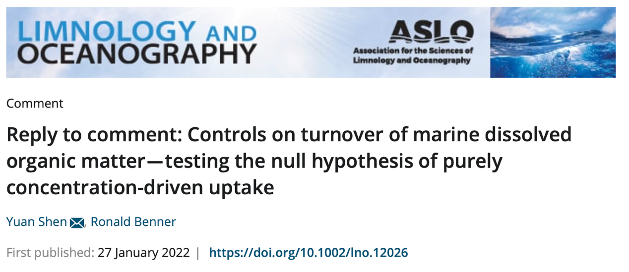 Yuan Shen* & Ronald Benner (2022). Reply to comment: Controls on turnover of marine dissolved organic matter—testing the null hypothesis of purely concentration-driven uptake. Limnology and Oceanography, doi.org/10.1002/lno.12026