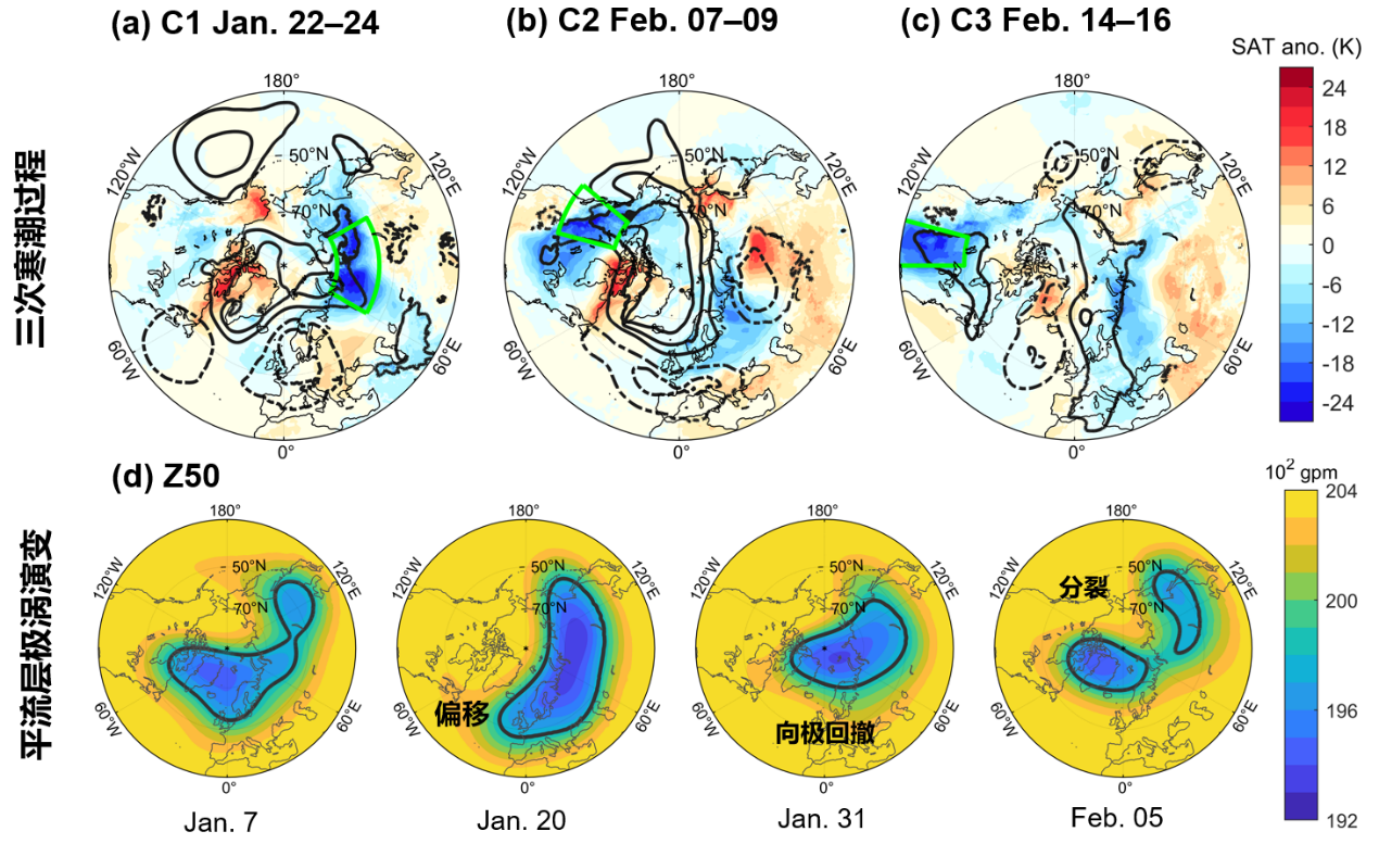 本研究基于季节-次季节尺度集合预报与敏感性分析,揭示了SSW对2021年1–2月发生在西伯利亚地区、加拿大西部和美国中部三次主要寒潮过程(图1a–c)的影响。分析表明,平流层极涡在减弱期间,首先偏移向欧亚大陆一侧,随后回撤至极区并向北美大陆一侧分裂,经历了显著的形态转变过程(图1d)。