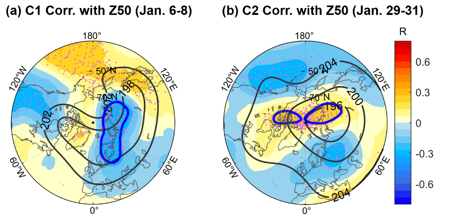 图2 基于集合预报的寒潮强度与平流层极涡的相关性分布。(a)第一次寒潮过程(C1)区域平均地面气温与50-hPa位势高度的相关系数分布(填色);黑色实线为集合平均的50-hPa位势高度,表征极涡位置;蓝色实线为集合敏感性分析得到的高相关区域。(b)与(a)相似但为第二次寒潮过程(C2)相关结果。