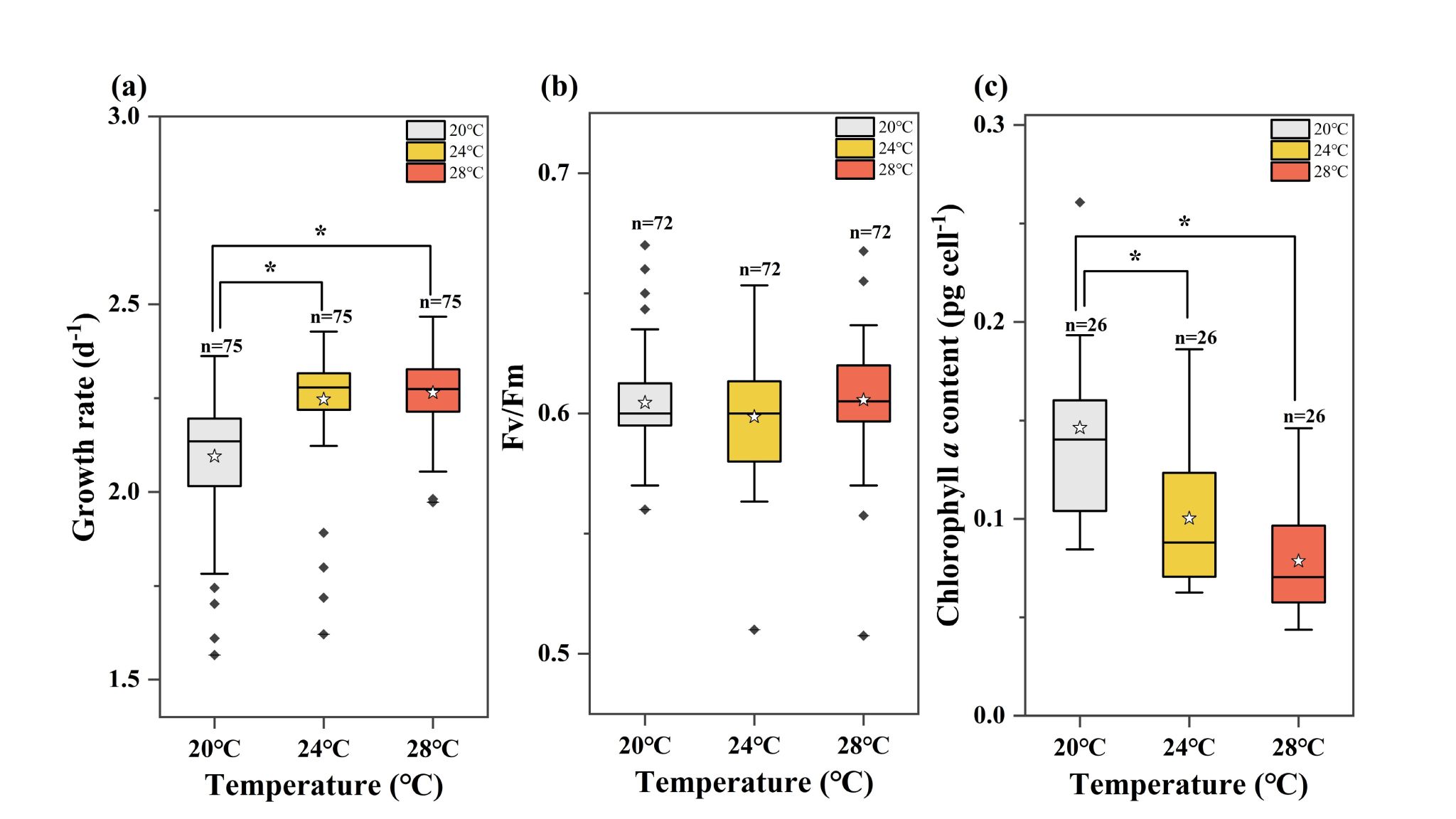图1 升温对多尼骨条藻(700代)生理特征的影响:(a)生长速率;(b)Fv/Fm;(c)叶绿素a含量