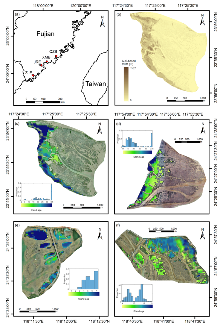 图1 福建省主要的4个红树林湿地空间位置(a)、无人机影像(摄于2020或2021年)及其红树林年龄(2020年)的空间与概率分布:c:漳江口(ZJE);d:九龙江口(JRE);e:厦门湾(XMB);f:泉州湾(QZB)。b为通过机载激光雷达(ALS)获取的冠层高度(CHM)空间信息。