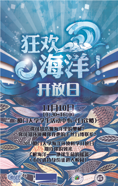 11月10日(星期日)10:30-16:00,厦门大学将在厦门大学自钦楼举办“第二届厦门大学海洋环境科学开放日”面向市民开放。活动由中国海洋科学卓越教育伙伴计划(COSEE China)、厦门大学近海海洋环境科学国家重点实验室、海洋与地球学院、环境与生态学院共同主办。
