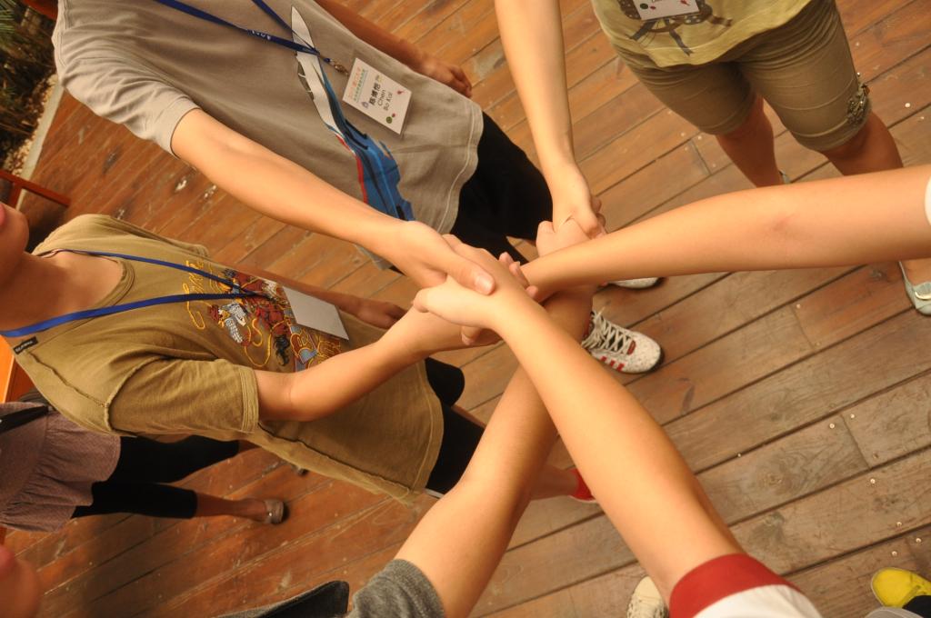 在厦门大学海洋楼的第一天,孩子们通过分发到手上的短语,寻找自己所属的水生生物种群,被分为鲨鱼、海豚、贝壳、珊瑚、红树林、浮游生物等六个组。各组成员通过“解手结”、“坐地起身”“记忆力撞击”等各种游戏迅速认识,并熟悉起来,为活动的进一步开展奠定基础。