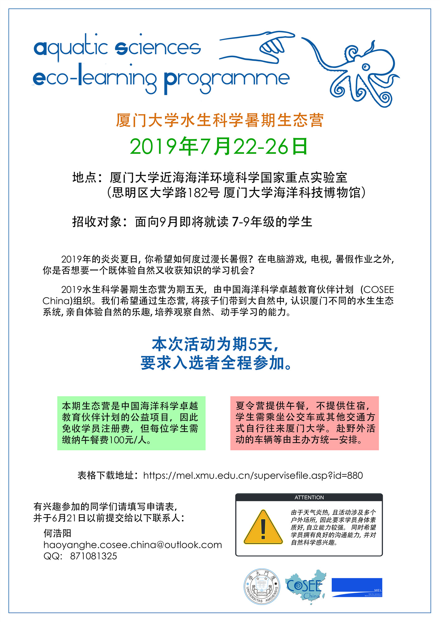 2019水生科学暑期生态营为期五天,由中国海洋科学卓越教育伙伴计划(COSEE China)组织。我们希望通过生态营,将孩子们带到大自然中,认识厦门不同的水生生态系统,亲自体验自然的乐趣,培养观察自然、动手学习的能力。