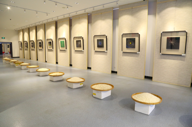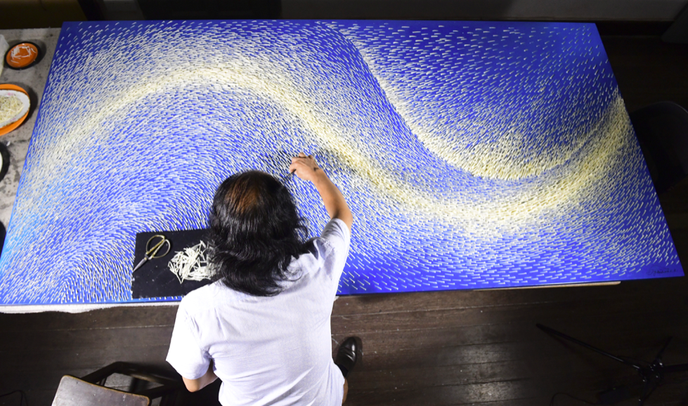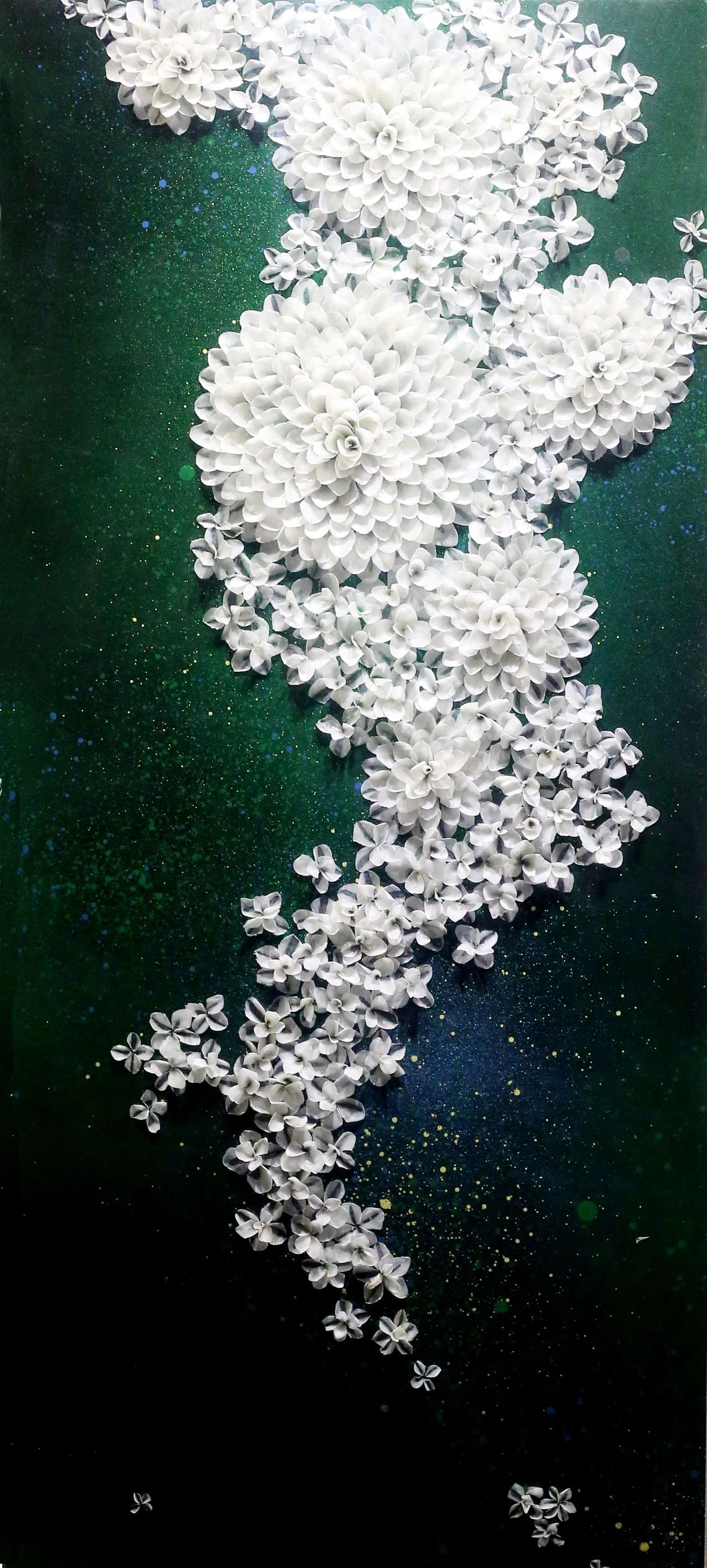 这幅作品希望呈现出春天百花竞放、芬芳馥郁的景象。采用的是深海鱼的鱼鳞进行创作,这种鱼鳞质如白玉,形似花瓣,能够非常好的展现出花海绽放的景象。