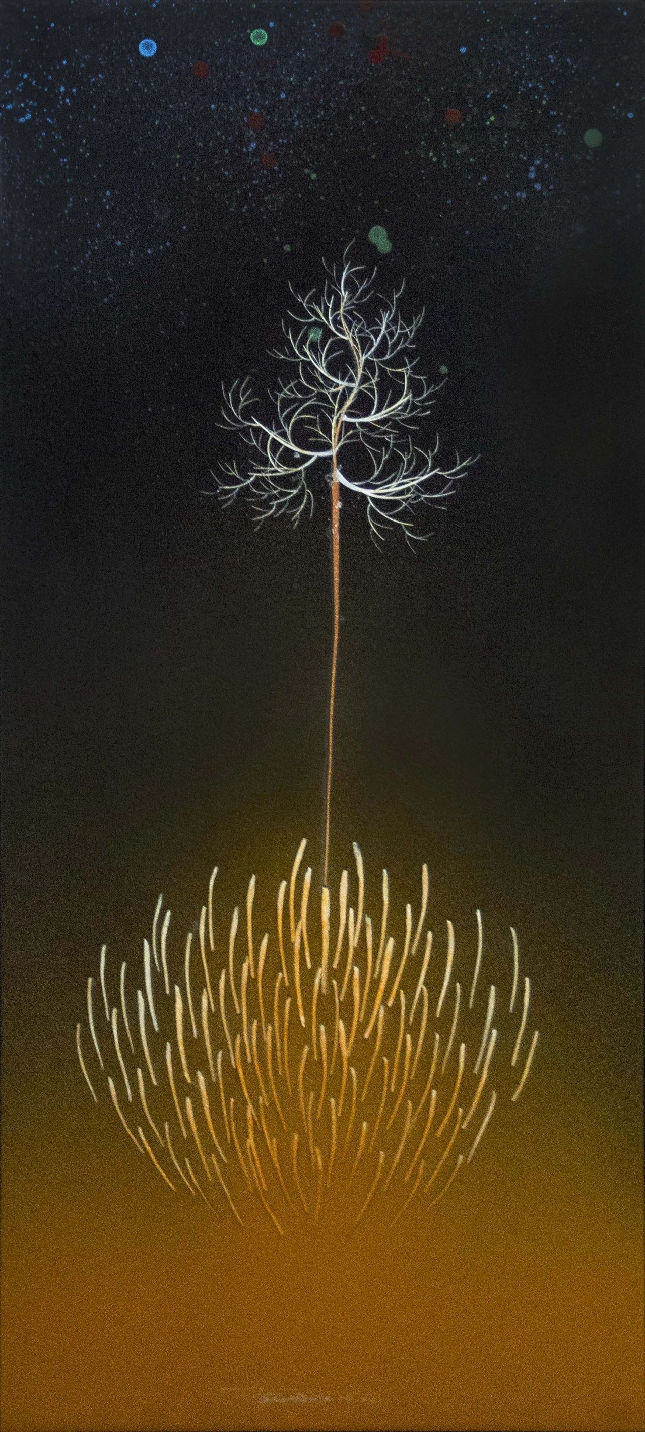 牛顿从苹果落地发现了万有引力,而这幅作品所表现的正好相反。地球失去引力,苹果、树叶都往天空飘去。人类无休止地开采地球资源,无休止的掠夺地球资源,当地球资源耗尽,这一天来临时,人类还能够在地球上生存吗?