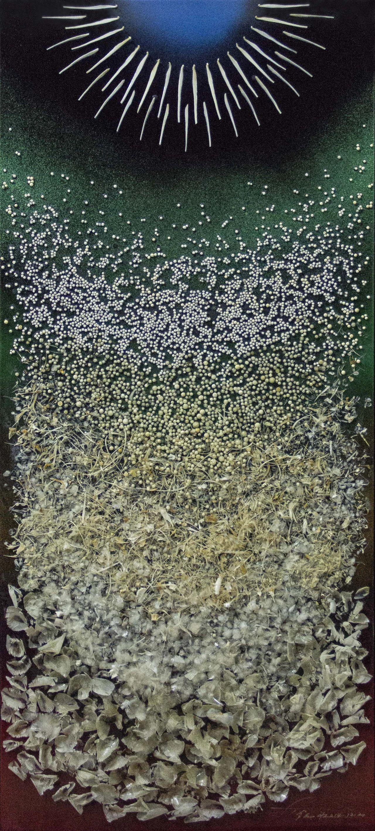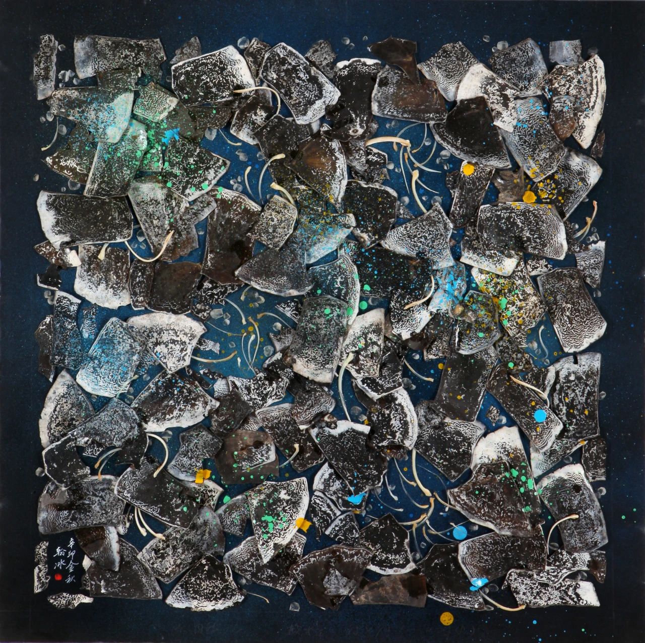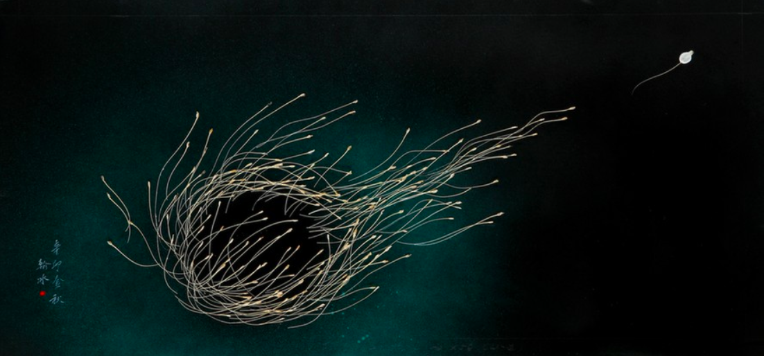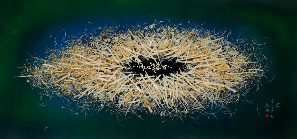 这幅作品选用的是寻常的鱼骨,但材质和肌理效果很出色。画面上是一个鸟巢的造型,作品名字叫《蕴》,不仅代表孕育生命,也代表蕴有一切未发生的新生事物。
