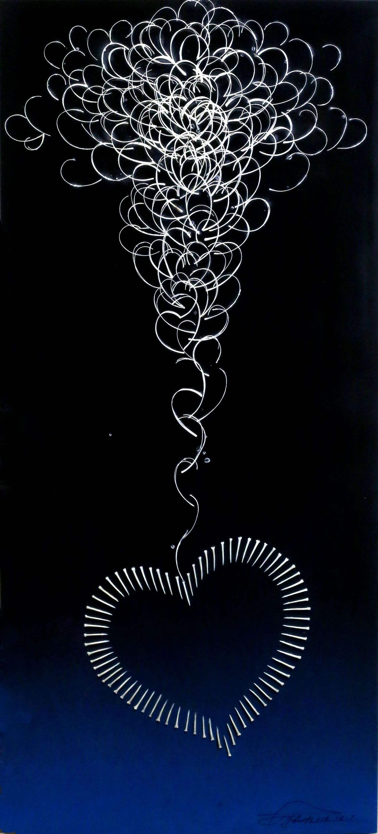 《污染源》是一幅环保题材的作品,画面上从一颗心冒出的浓烟,污染了整个世界,污染了人类赖以生存的自然环境,令人触目惊心。这块像烟雾一样的鱼骨材料,是一种深海鱼的鳃鳍骨,经晒干后自然弯曲,形如烟雾,形象生动;下面这颗心是采用鱼的背鳍骨组合而成,每一根鱼骨就像一支支钢针扎进我们心头,时刻提醒人们要关注自然,依循其道,活于自然。