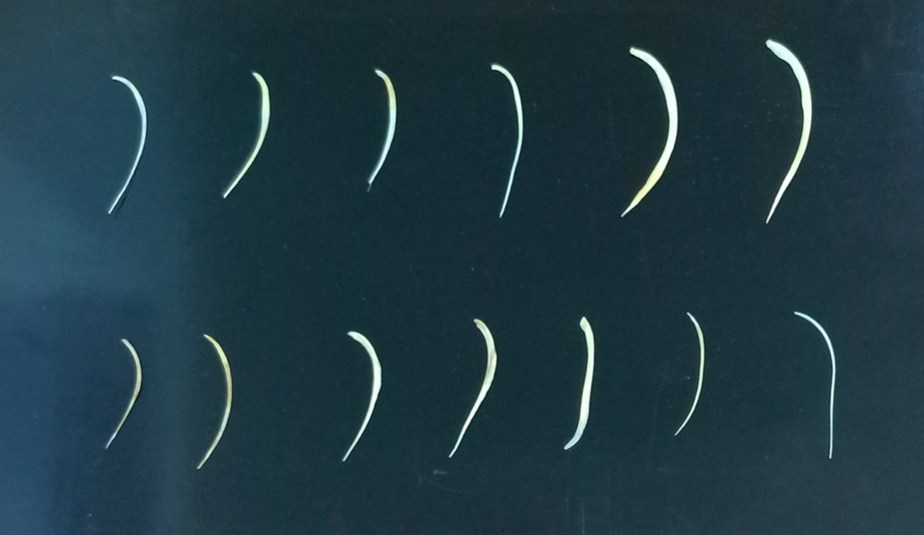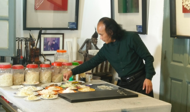 鱼骨收集回来,要经过脱肉、去腥、去味、净白、晾晒、烘干、防霉、防腐等12道工序才可以作画。在经过12道工序处理后,要先根据材质造型、大小、类别进行分类,然后装进透明的瓶子里储存,便于作画时选材。