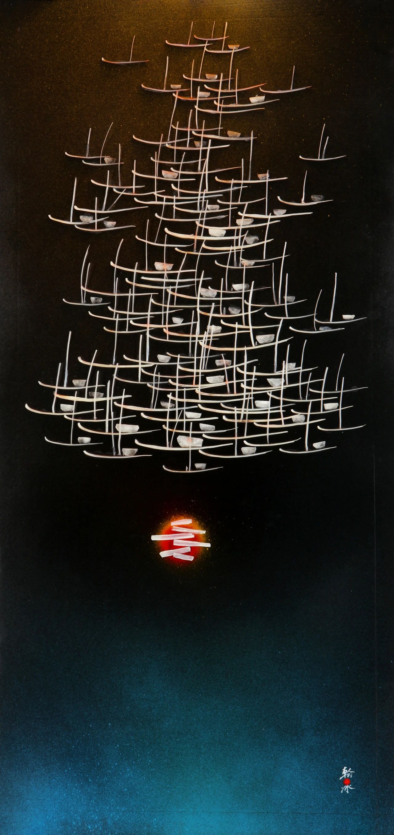 这幅作品表现的是渔港清晨太阳刚刚升起时的景象。作品中的渔船是一种深海鱼的鱼鳍。这块鱼骨的造新像一艘木质渔船,具有雄浑洗练、淳朴大方的感觉,用它来表现上百艘渔船静静停泊在港湾的场景,蔚为壮观。