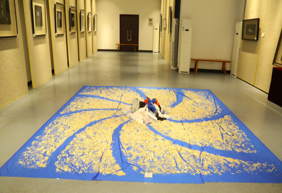 根据鄱阳湖干旱创作的作品《渴》,这幅作品创作灵感来源于2011年鄱阳湖大旱。使用的材料是鱼的头骨,扇形的鱼头骨组合呈现出地面干裂的情景,半个地球因干渴而龟裂,唯一剩下的一棵树树叶全都掉光了。