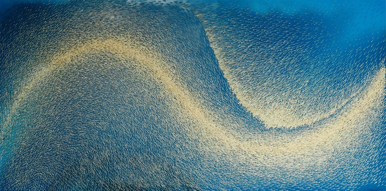《海魂》这幅作品2018年获中国工艺美术精品“百花杯“金奖,也是我重要的代表作之一。这幅作品造型既像成千上万条鱼群,又像汹涌澎湃的海潮。作品寓意是水要有鱼,要有很多鱼,要有很多快乐的鱼,这样的水才是活水,才真正具有灵魂。说明只有生态保护很好,这样的海洋才有灵魂。